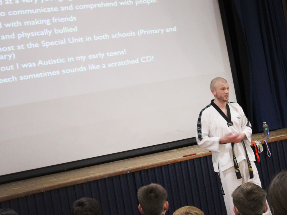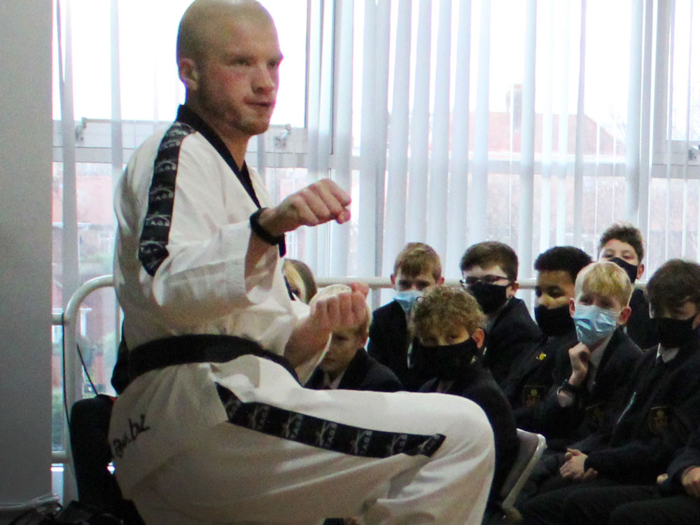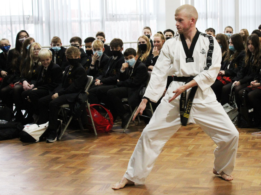 All of Year 7 had the opportunity to hear and see award-winning Tae Kwon Do routines from Matty Moore, an inspirational young man who has overcome his struggles to show that you can achieve great things whilst dealing with a disability. Matty has struggled all of his life with autism and Asperger’s and he was introduced to Tae Kwon Do at the age of 14. Through hard work and determination, Matty has gone from strength to strength and is now a third-degree blackbelt. He was taken part in national and international competitions winning gold, silver and bronze medals. Matty talked to our Year 7 students about how he has learned to live with his brain being wired-up differently and about his struggles with his disability. He was also able to demonstrate his fantastic skills to show what can be achieved with hard work, discipline and determination.