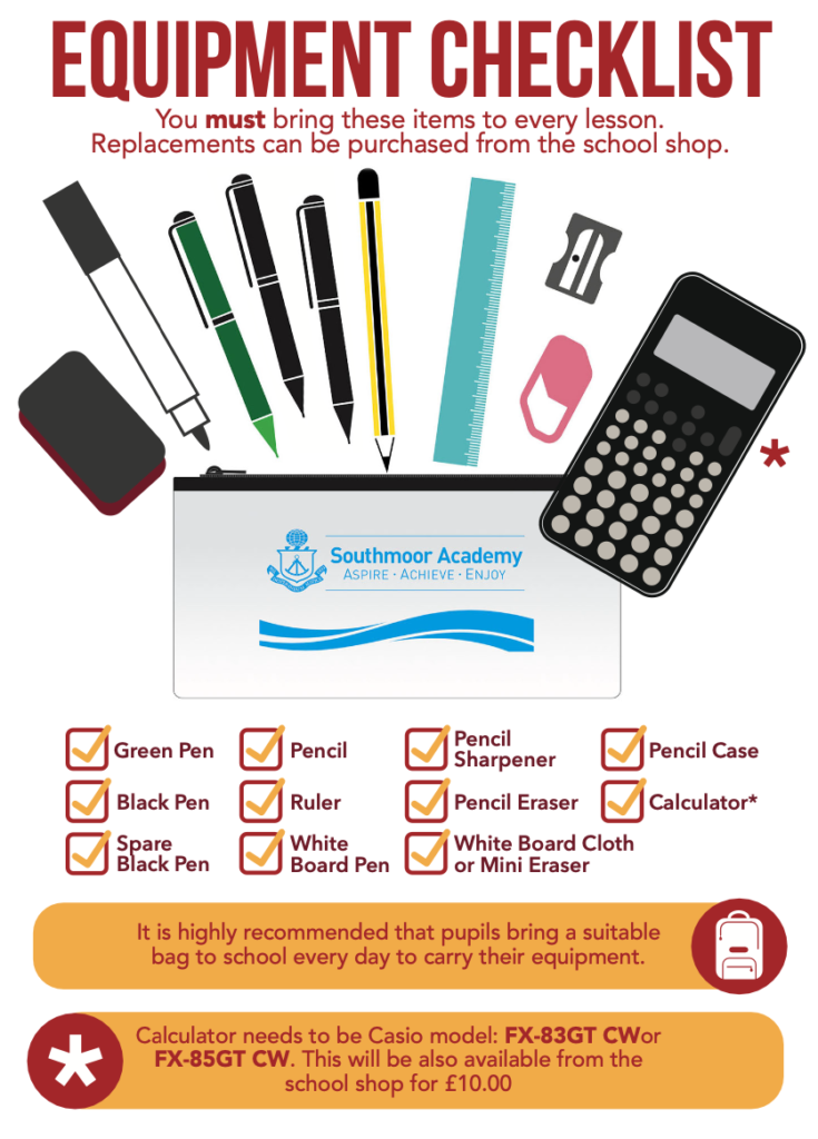 Southmoor students are expected to bring a minimum amount of equipment to each lesson. Equipment should be well maintained and kept safe in a pencil case. Your pencil case should contain the essential equipment you will need every day at school. Pupils must bring at least this equipment with them every day they are in school and keep it in good condition.