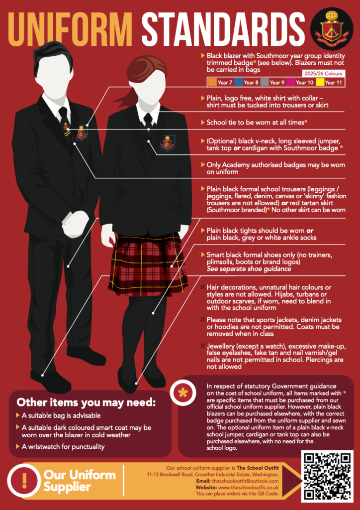 A high standard of personal appearance is expected of all of our pupils. The official school uniform should be worn at all times, including during examinations. Wearing our uniform identifies our students, not only with each other, but also as a member of our school community. The uniform associates students with the high standards of work conduct and dress we set them. All students at Southmoor Academy must wear school uniform.
