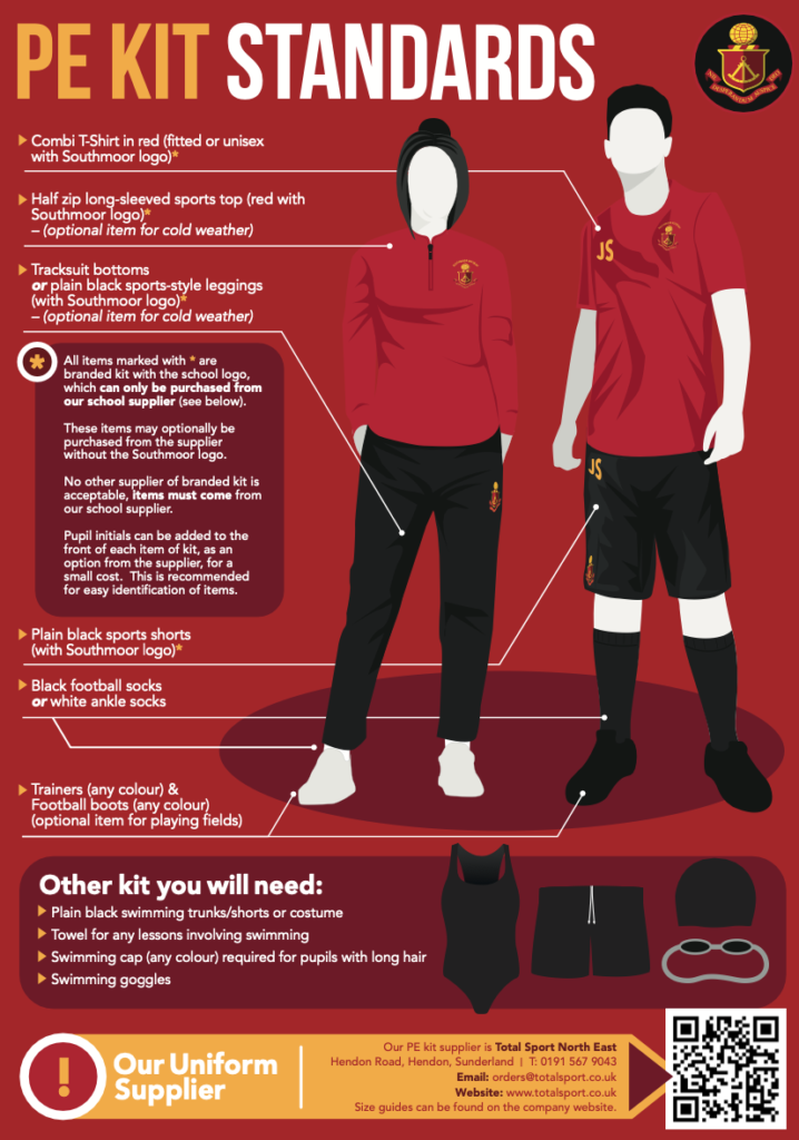 | PE Kit Supplier All items marked with * MUST be branded kit with school logo, which can only be purchased from school PE kit supplier: Total Sport North East Total Sport North East Limited, Hendon Road, Hendon, Sunderland, SR1 2JD T: 0191 567 9043 E: orders@totalsport.co.uk You can place orders for our school PE kit here You can download an order form hfor our school PE kit here Size guides can be found on the company website. |